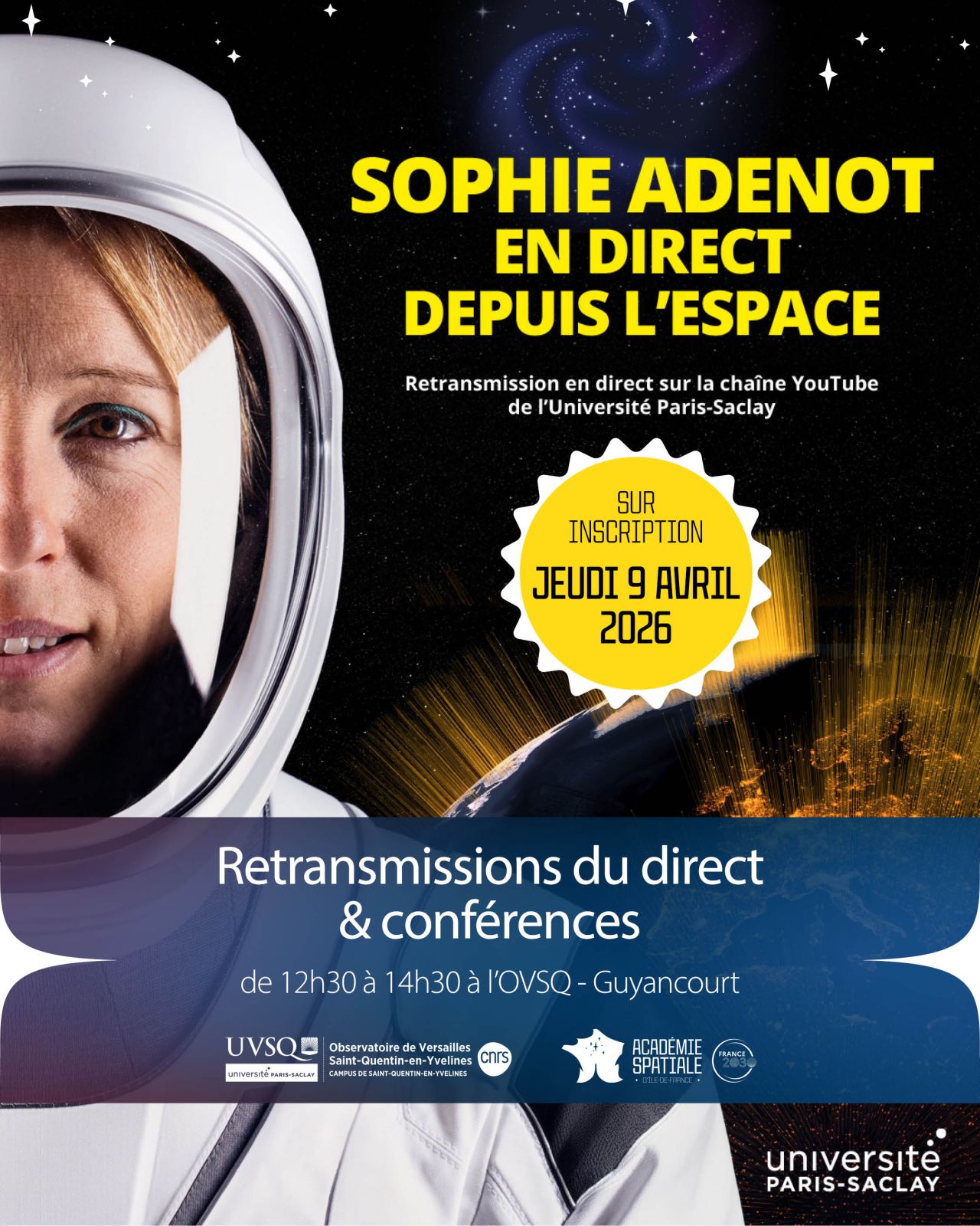 Le jeudi 9 avril 2026, l’Académie Spatiale d’Île-de-France et l’OVSQ co-organisent un évènement dont le point d’orgue sera la retransmission en direct du contact radio établi par l’Université Paris-Saclay avec Sophie Adenot, astronaute française actuellement à bord de la Station Spatiale Internationale.